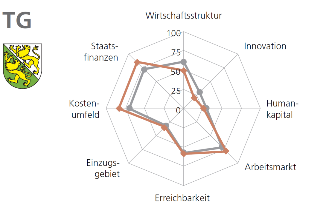 Dem Thurgau wird derzeit ein unterdurchschnittliches Innovationspotenzial attestiert, womit er im kantonalen Vergleich auf den hinteren Plätzen rangiert. In anderen Bereichen wie Staatsfinanzen oder Kostenumfeld schneidet er hingegen überdurchschnittlich gut ab.